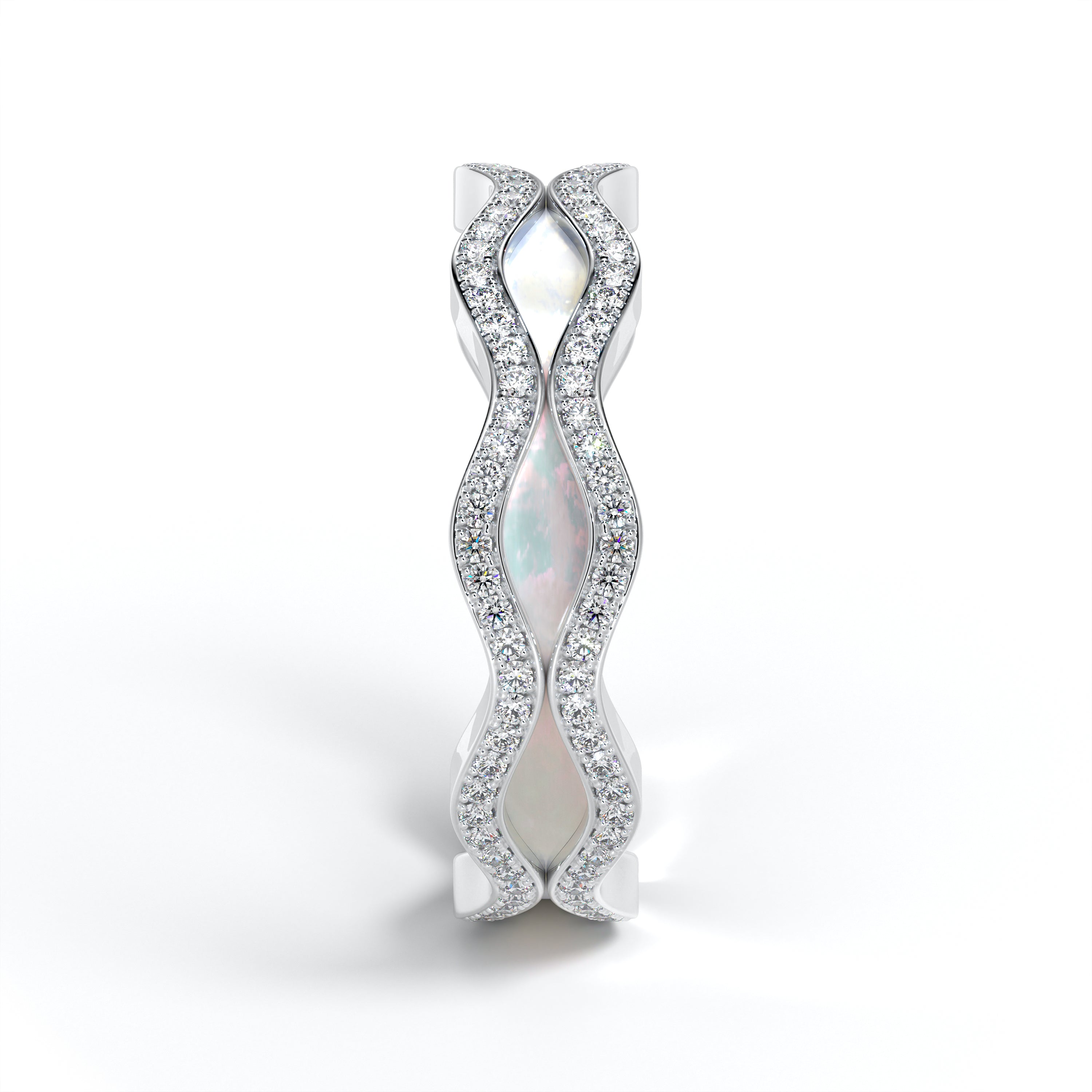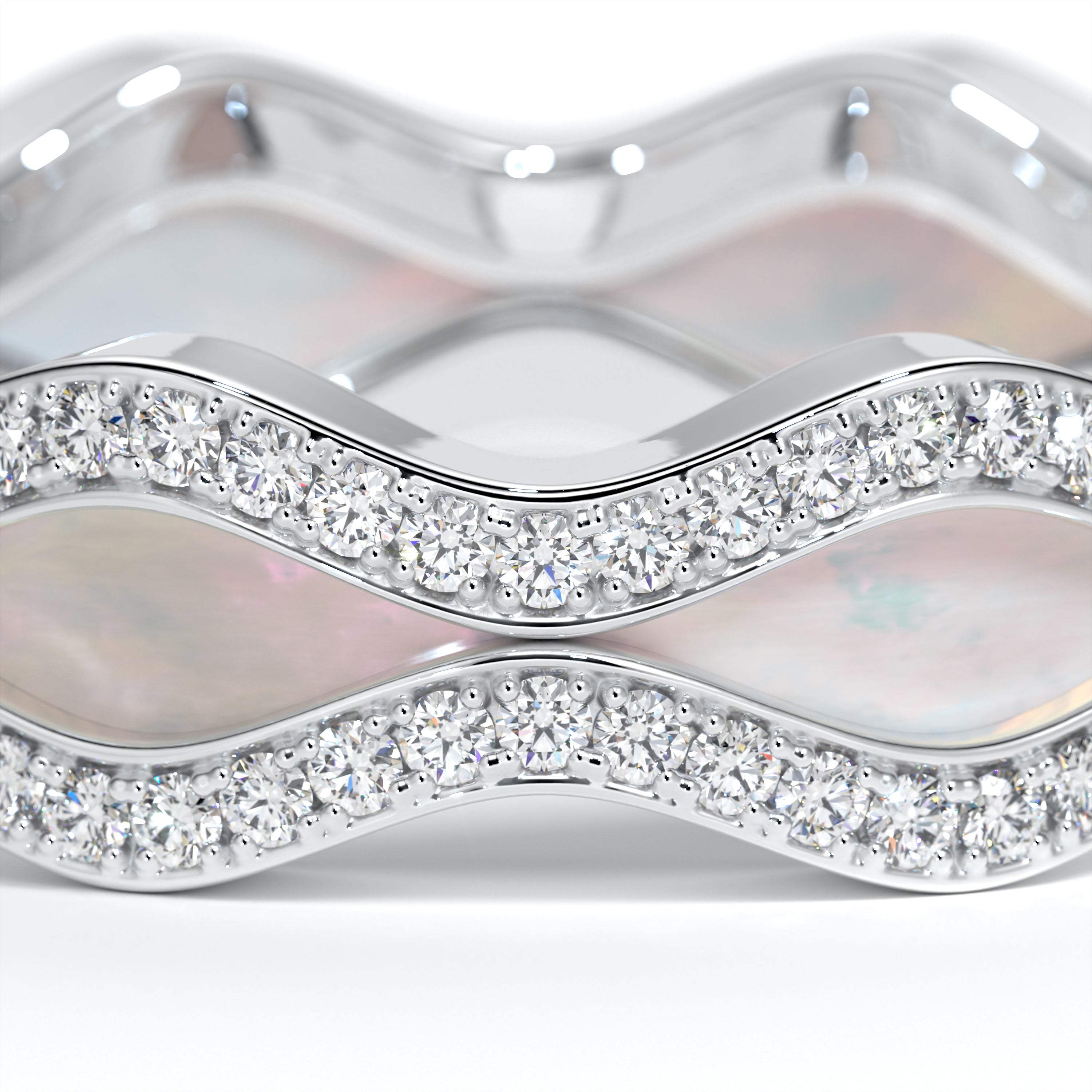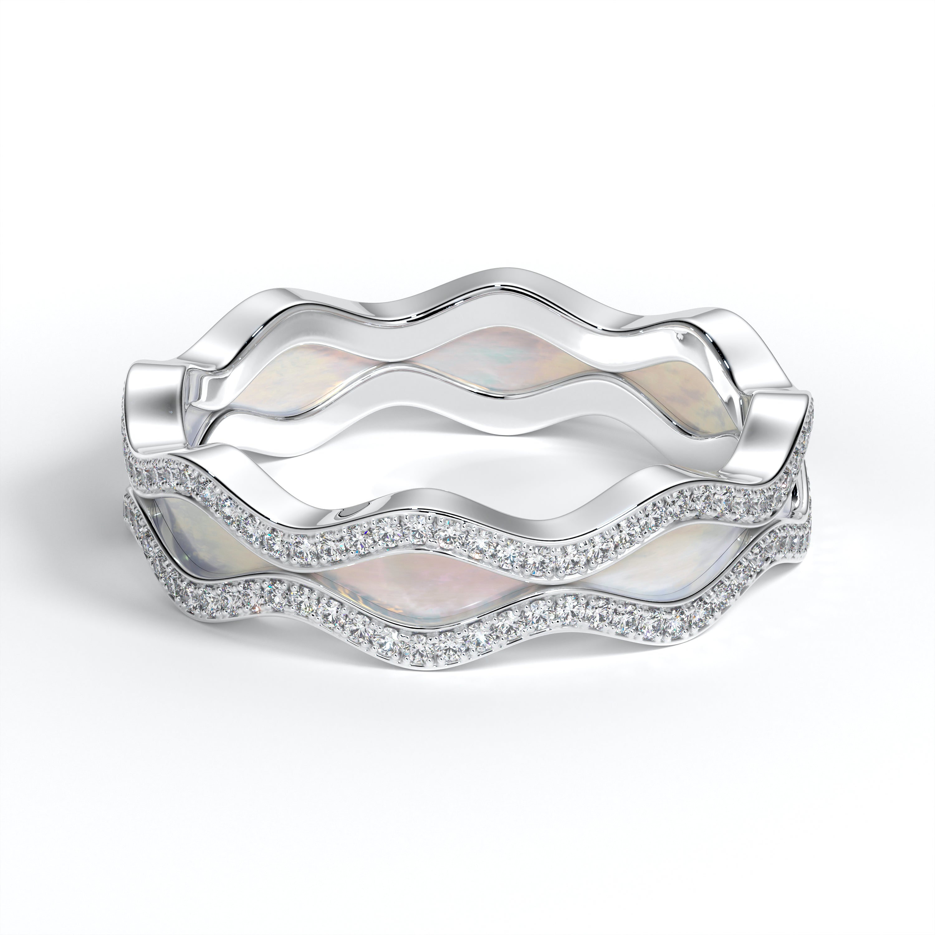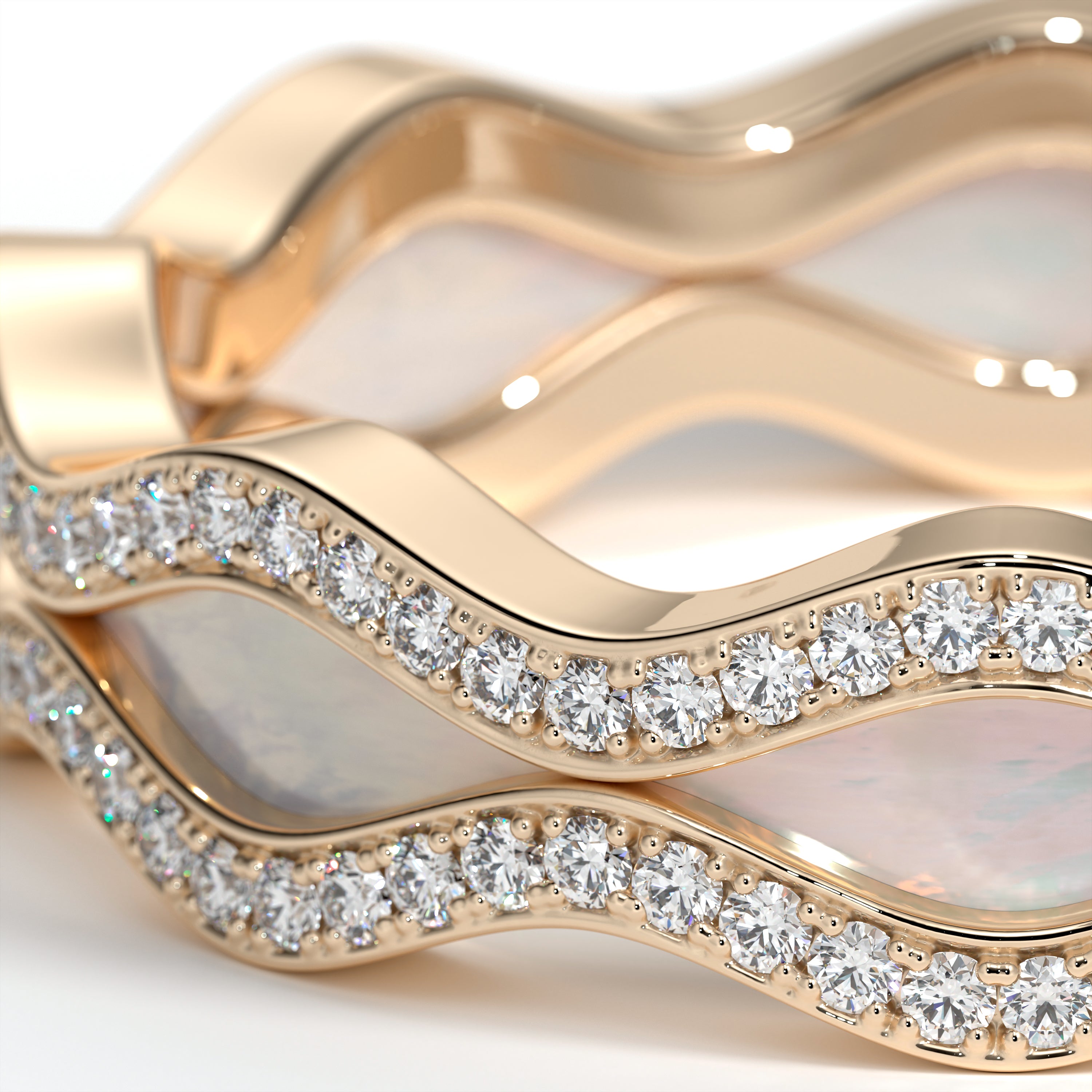 The Vivid collection is crafted with exceptional complexity, requiring the precise assembly of 10 to 18 individual parts, each demanding a perfect fit. The design celebrates the beauty of the Riviera through natural bends and flowing shapes, using mother of pearl to capture the hues of the ocean. The model itself is intricate, with a minimum of 10 parts required for the simple Vivid ring. The mother of pearl model consists of 18 parts, including 8 custom-shaped mother of pearl pieces for every ring, showcasing the detailed craftsmanship behind each design.