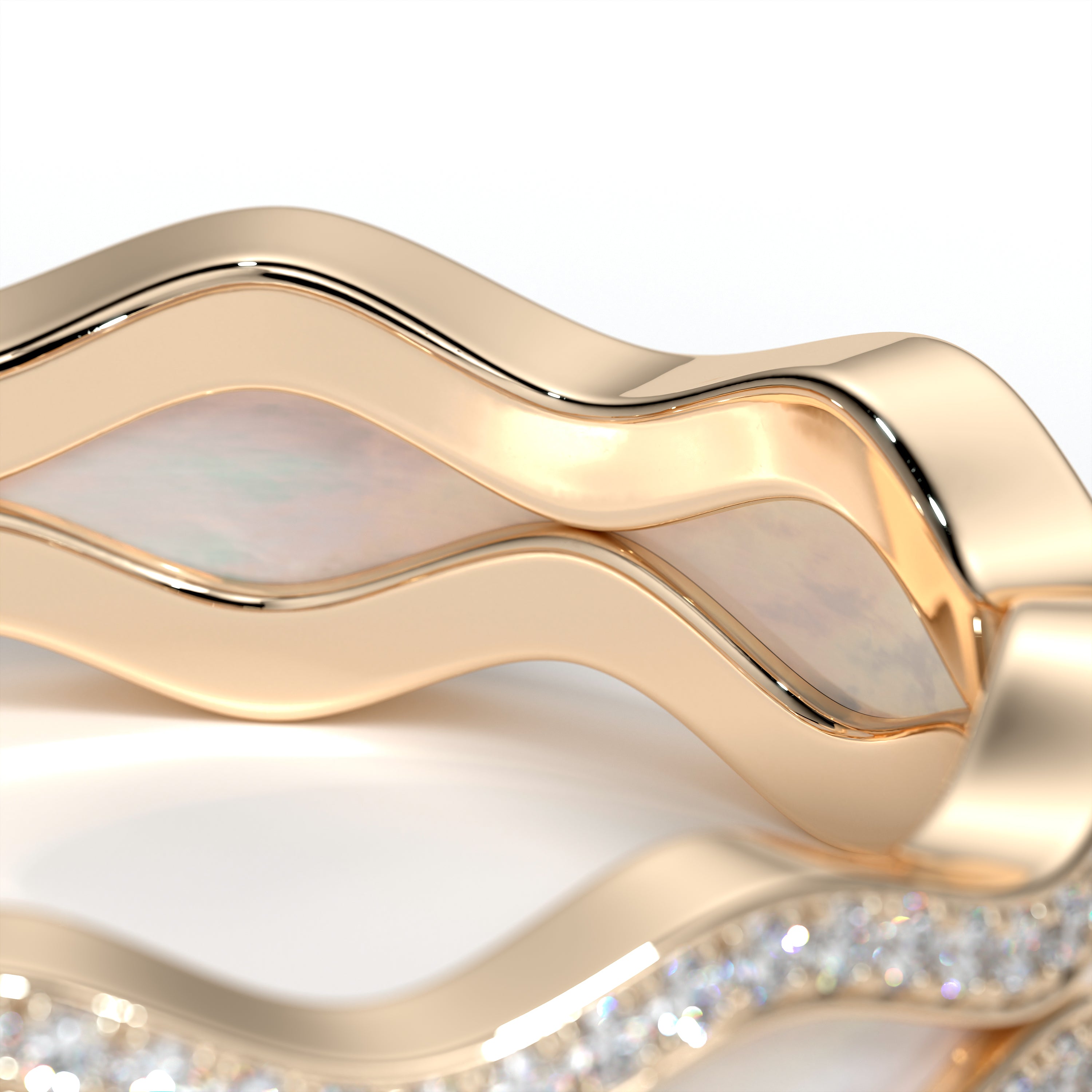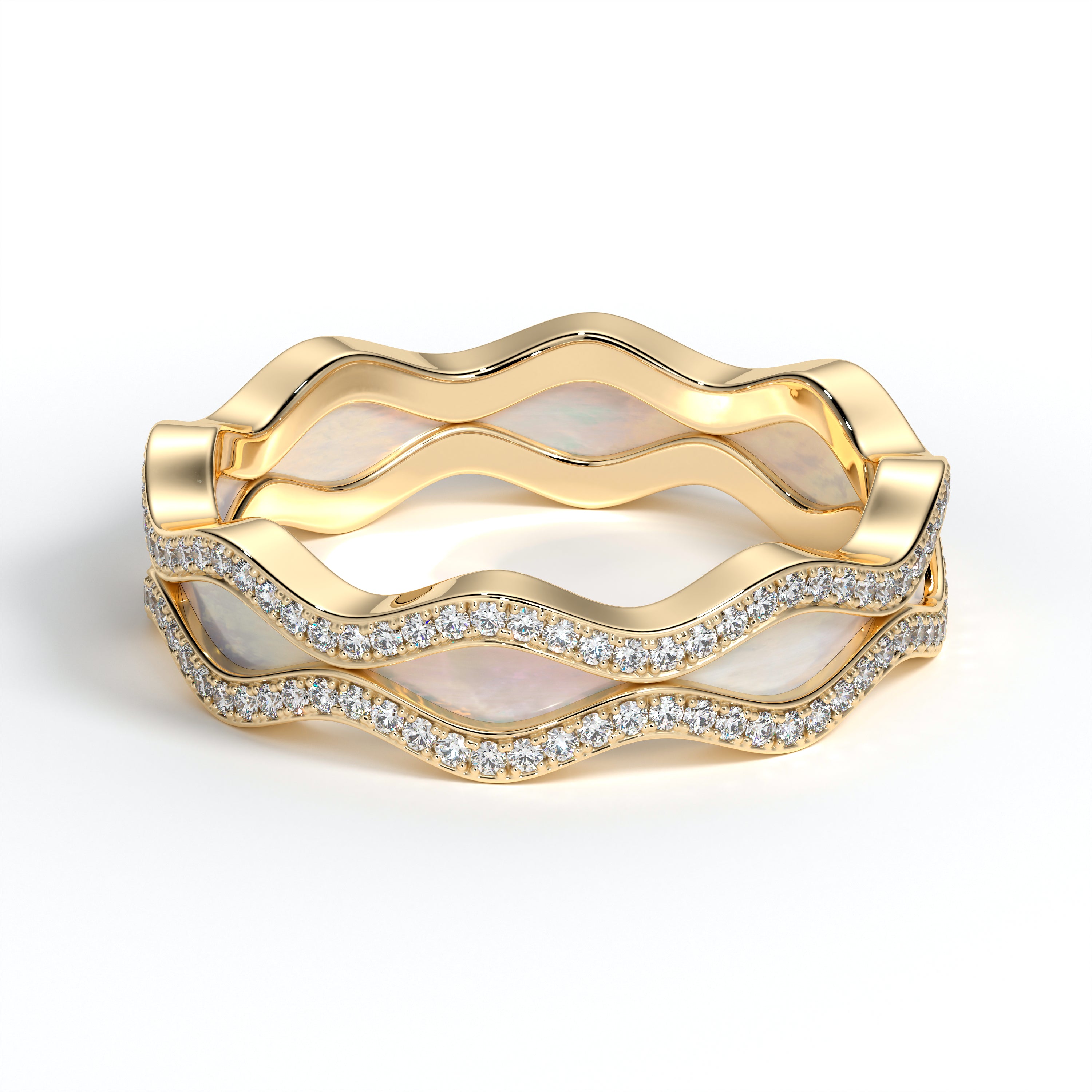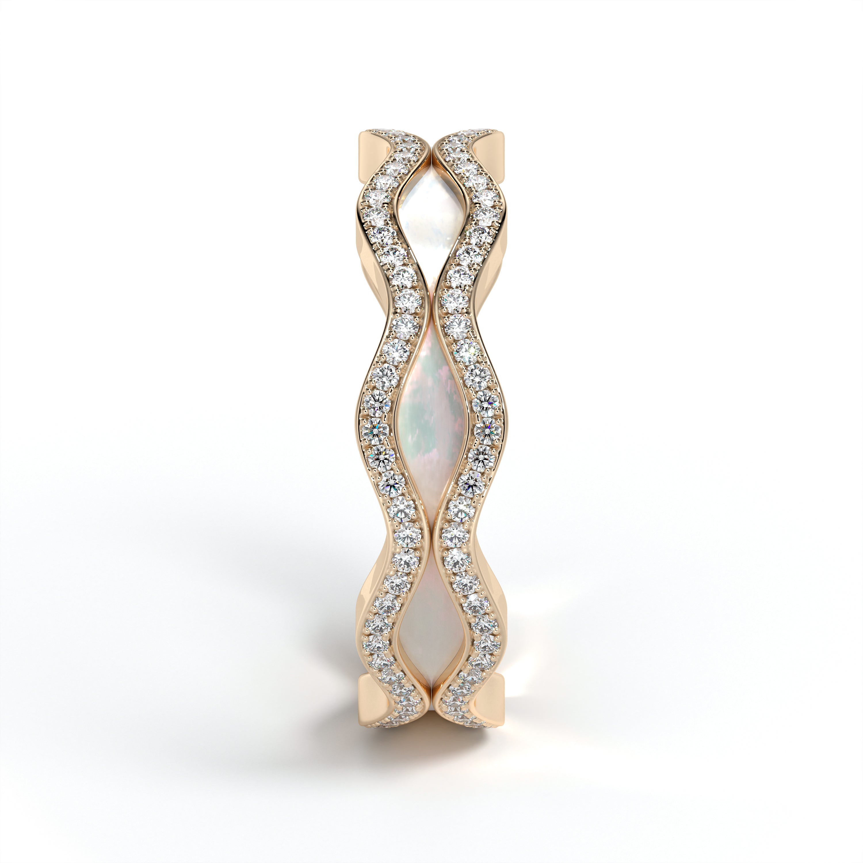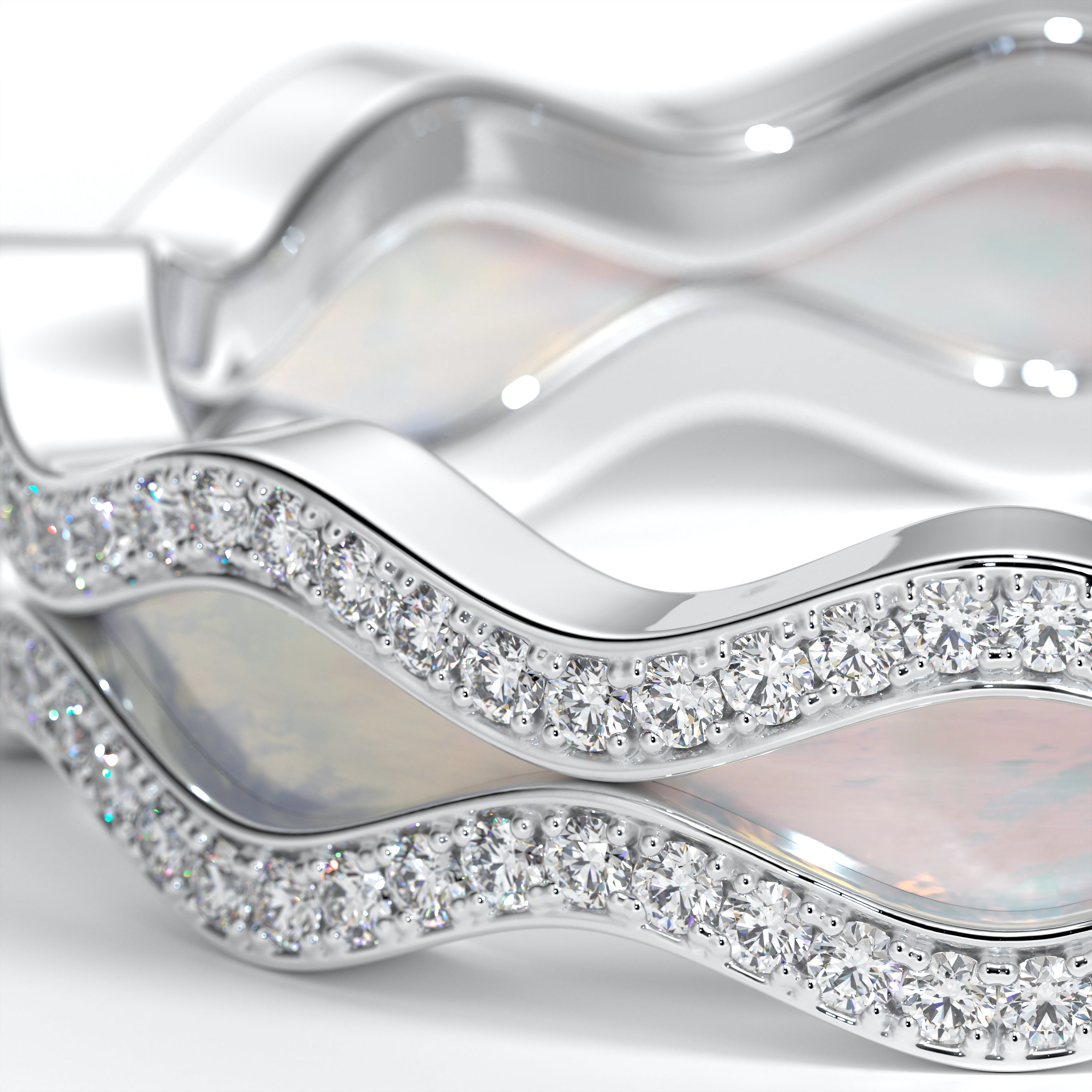 The Vivid collection is crafted with exceptional complexity, requiring the precise assembly of 10 to 18 individual parts, each demanding a perfect fit. The design celebrates the beauty of the Riviera through natural bends and flowing shapes, using mother of pearl to capture the hues of the ocean. The model itself is intricate, with a minimum of 10 parts required for the simple Vivid ring. The mother of pearl model consists of 18 parts, including 8 custom-shaped mother of pearl pieces for every ring, showcasing the detailed craftsmanship behind each design.