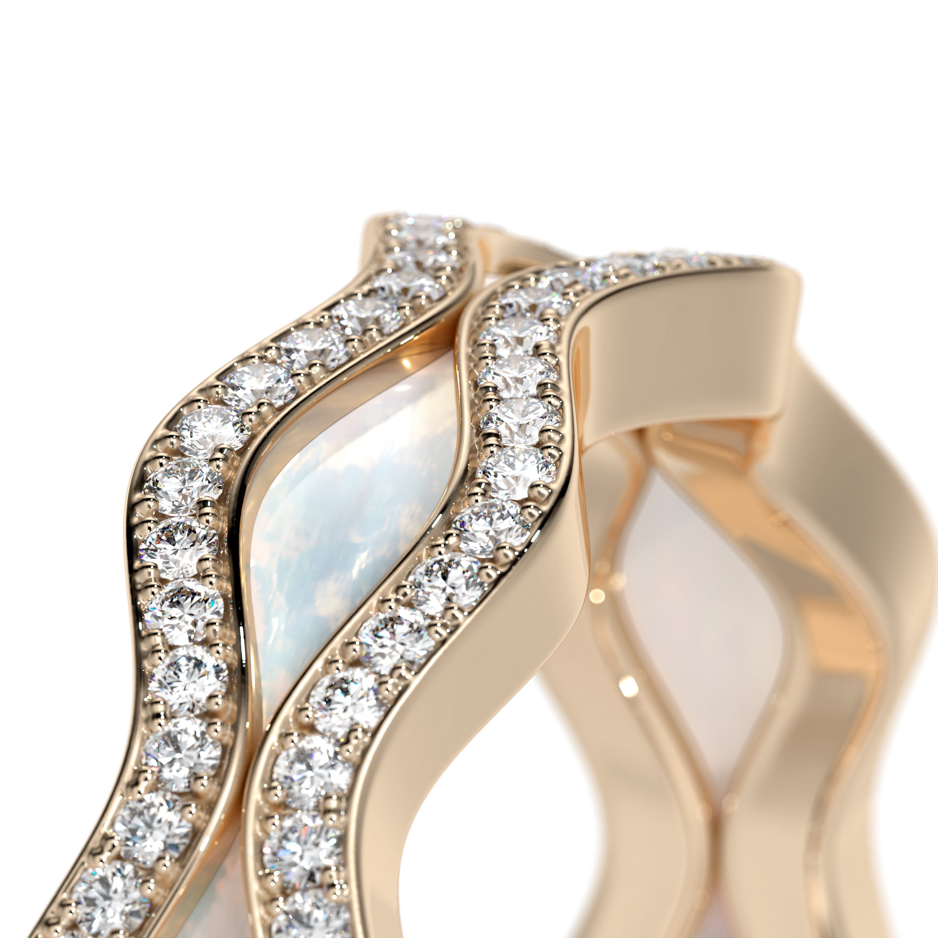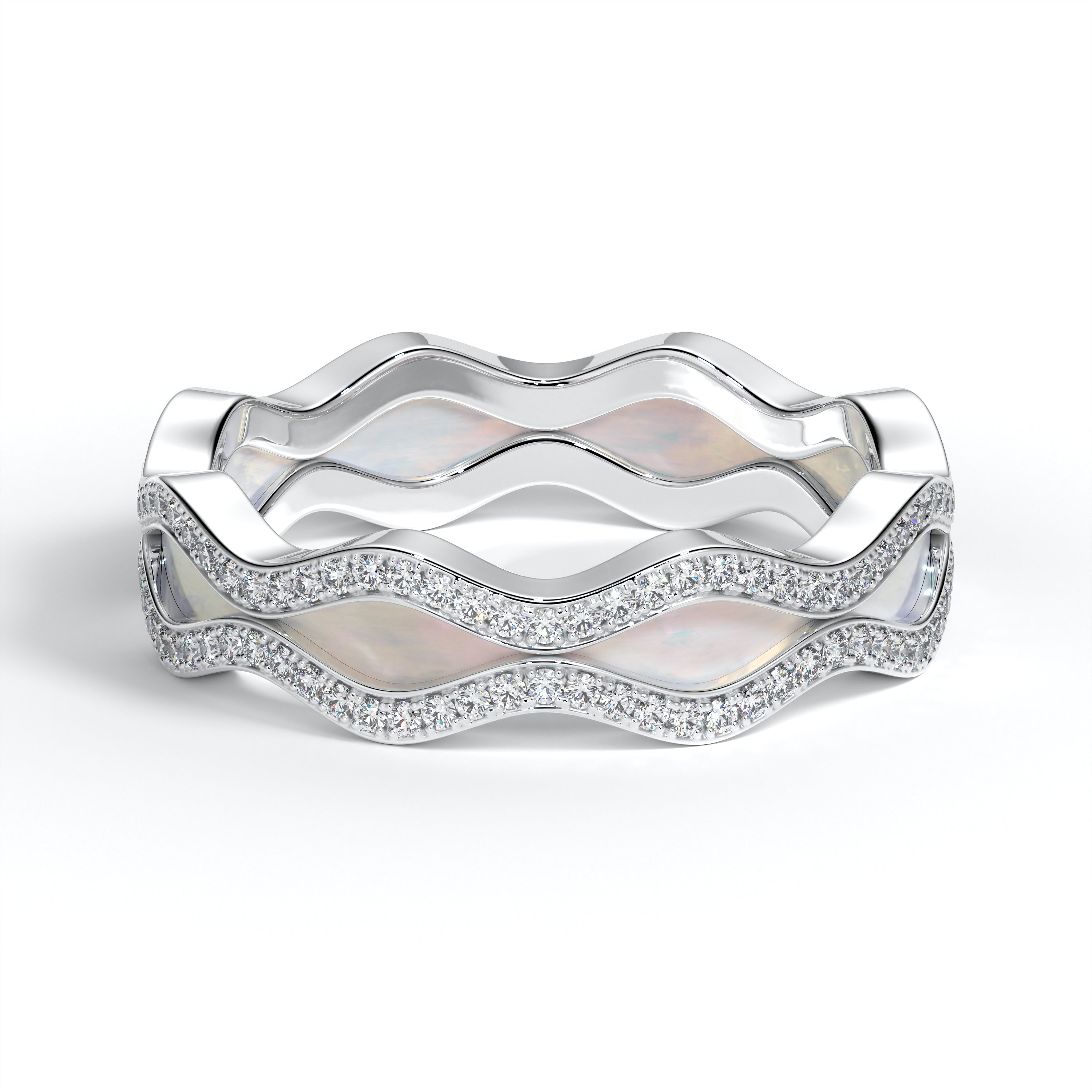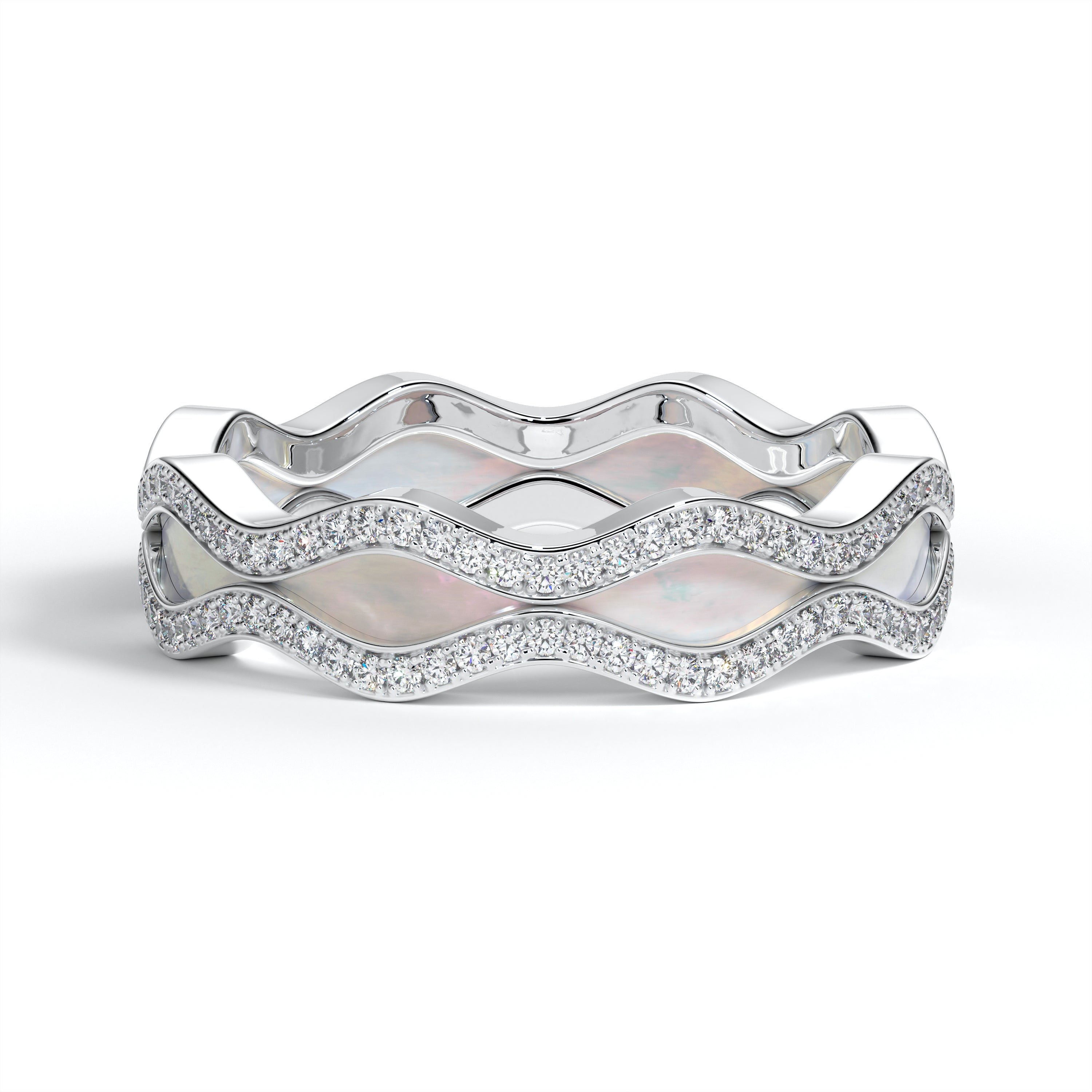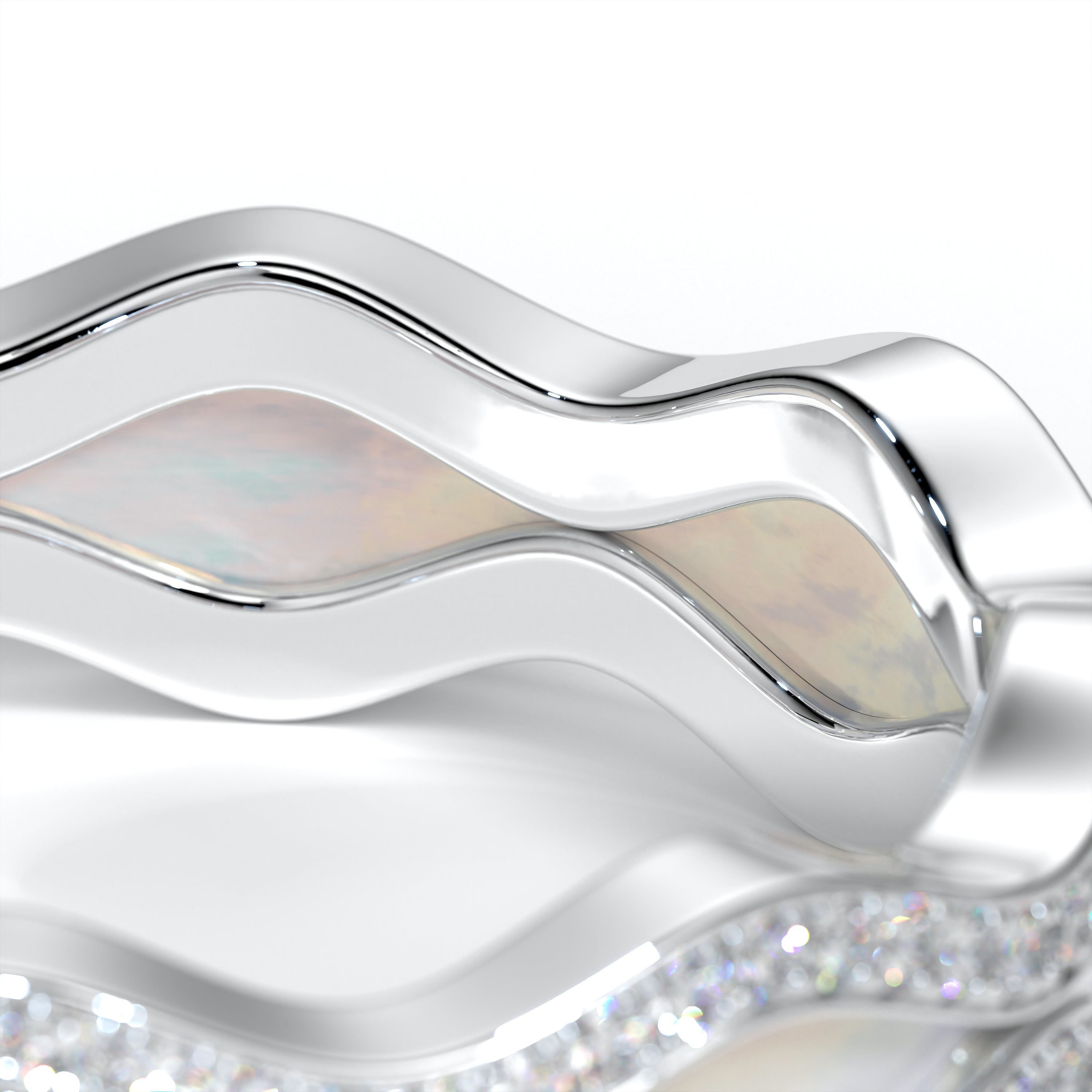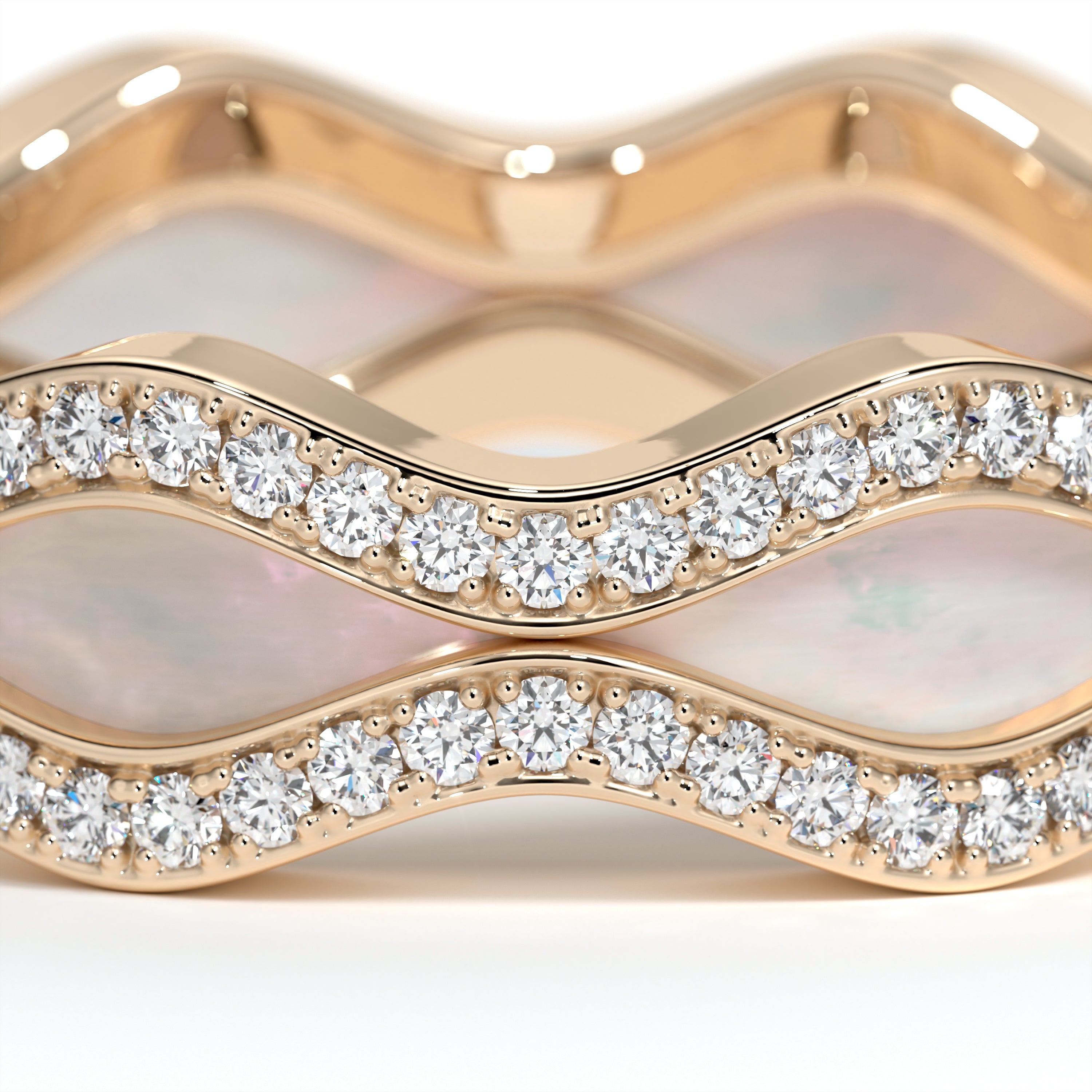 The Vivid collection is crafted with exceptional complexity, requiring the precise assembly of 10 to 18 individual parts, each demanding a perfect fit. The design celebrates the beauty of the Riviera through natural bends and flowing shapes, using mother of pearl to capture the hues of the ocean. The model itself is intricate, with a minimum of 10 parts required for the simple Vivid ring. The mother of pearl model consists of 18 parts, including 8 custom-shaped mother of pearl pieces for every ring, showcasing the detailed craftsmanship behind each design.