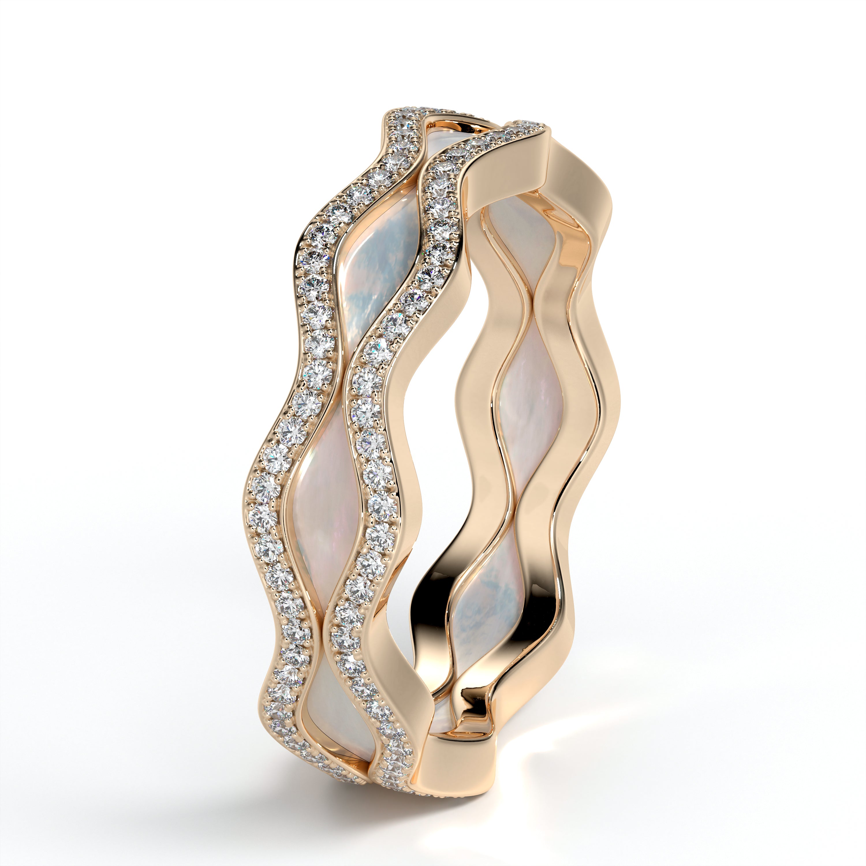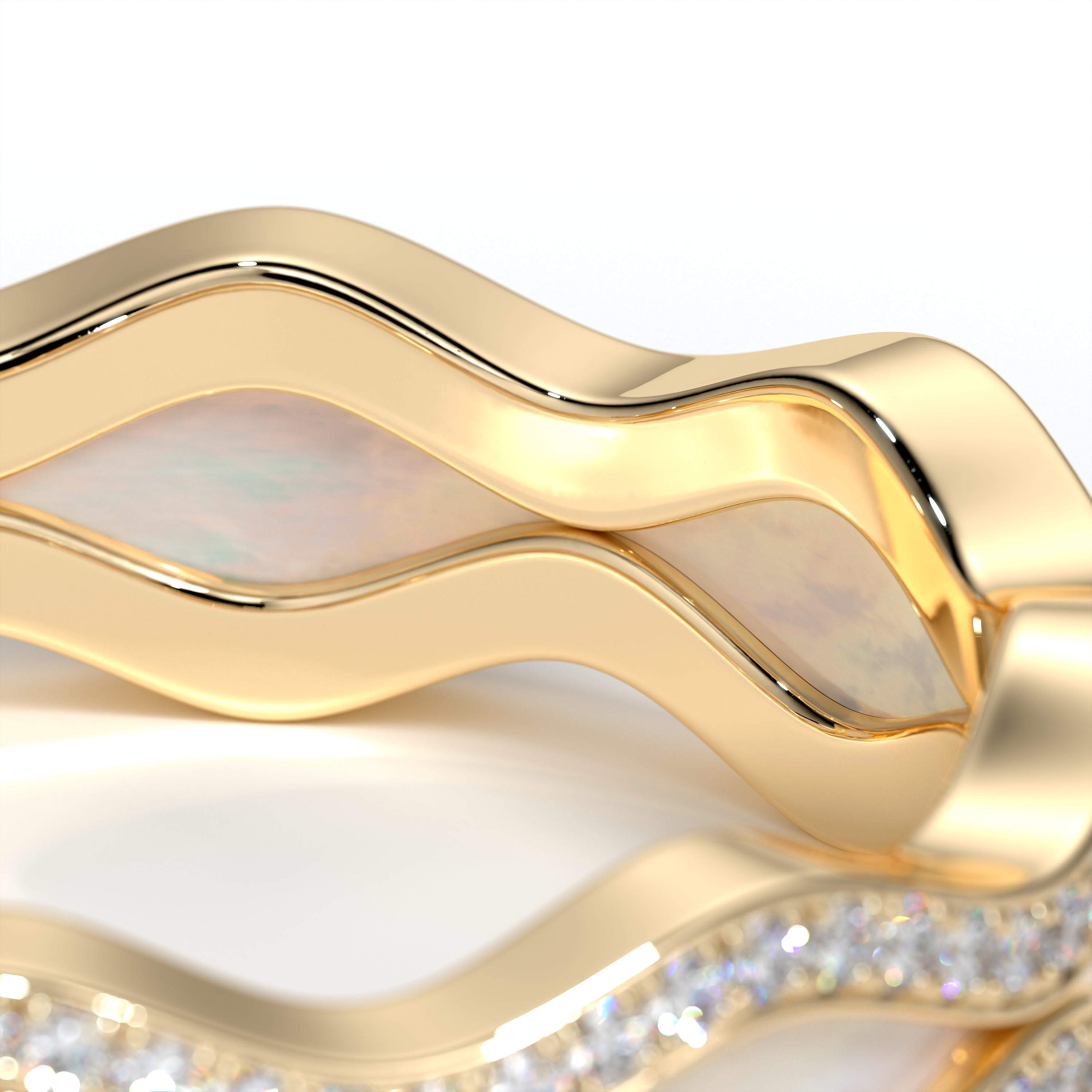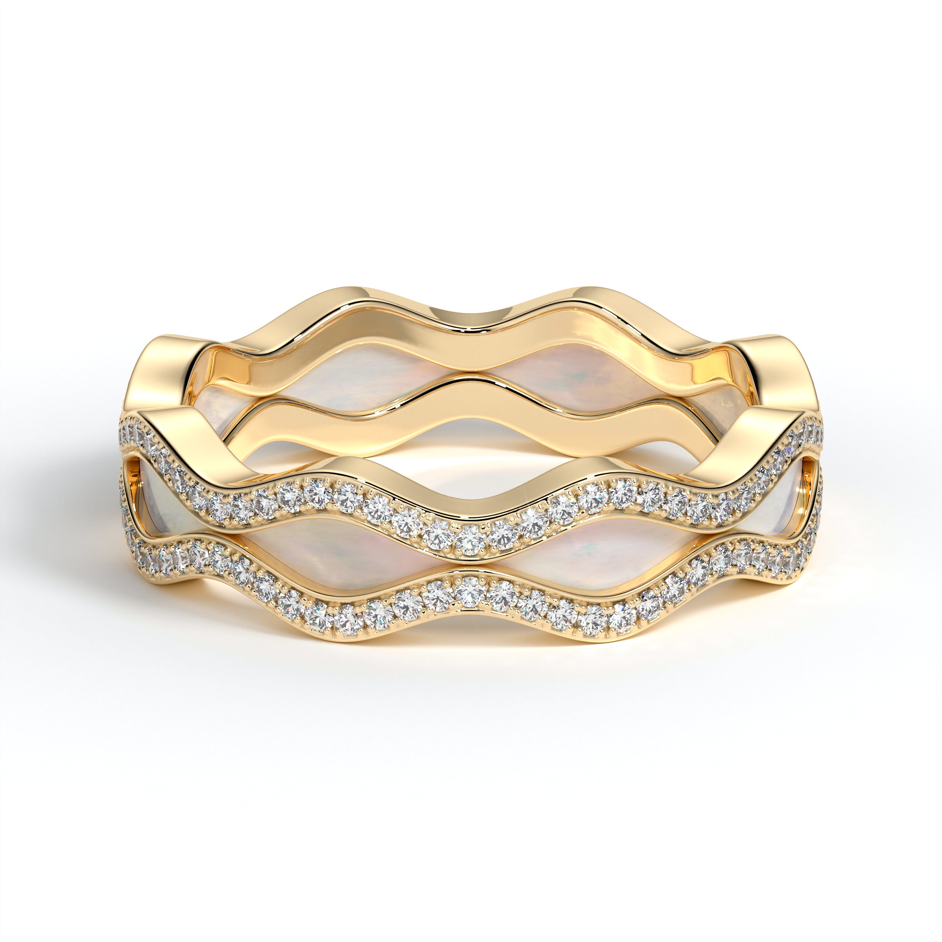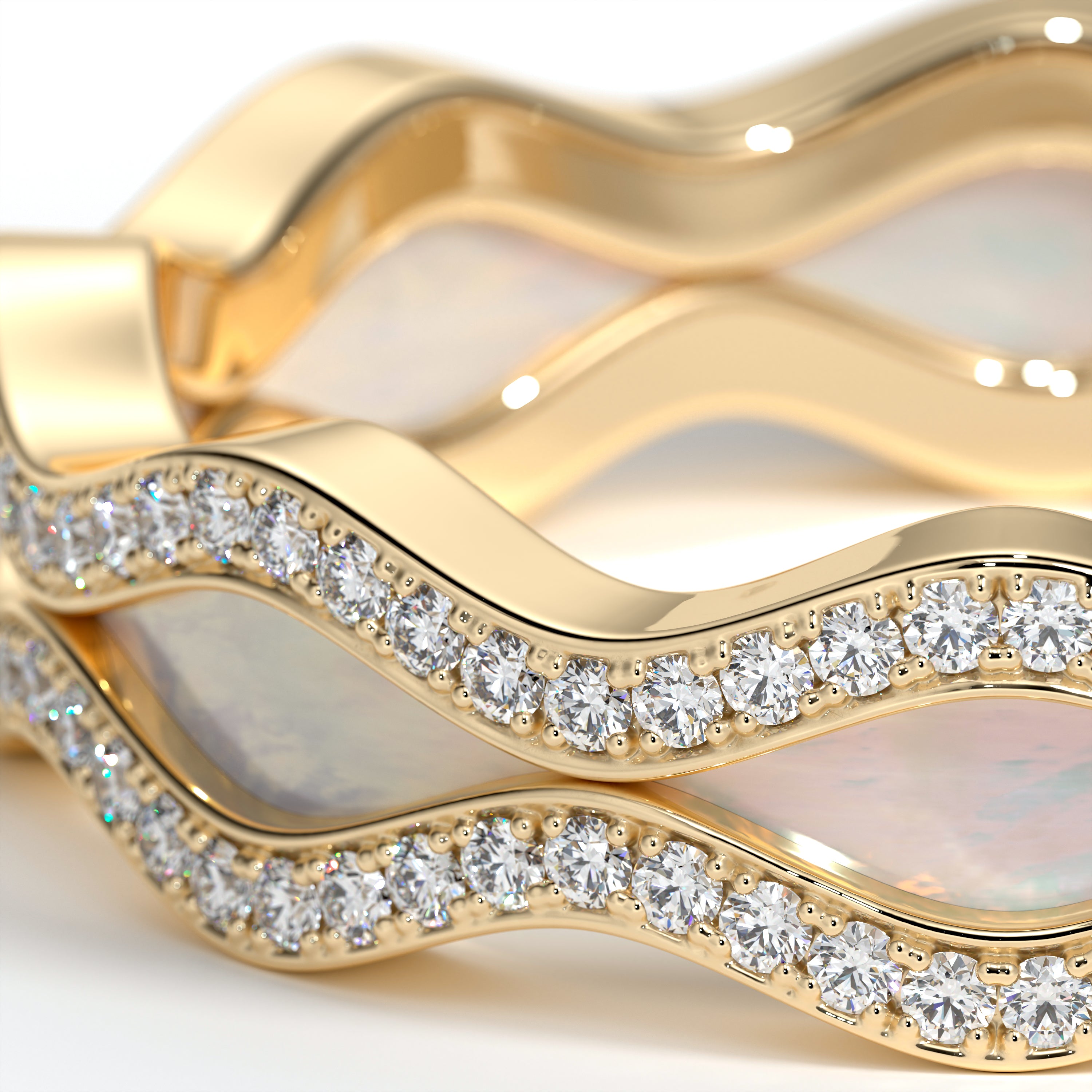 The Vivid collection is crafted with exceptional complexity, requiring the precise assembly of 10 to 18 individual parts, each demanding a perfect fit. The design celebrates the beauty of the Riviera through natural bends and flowing shapes, using mother of pearl to capture the hues of the ocean. The model itself is intricate, with a minimum of 10 parts required for the simple Vivid ring. The mother of pearl model consists of 18 parts, including 8 custom-shaped mother of pearl pieces for every ring, showcasing the detailed craftsmanship behind each design.