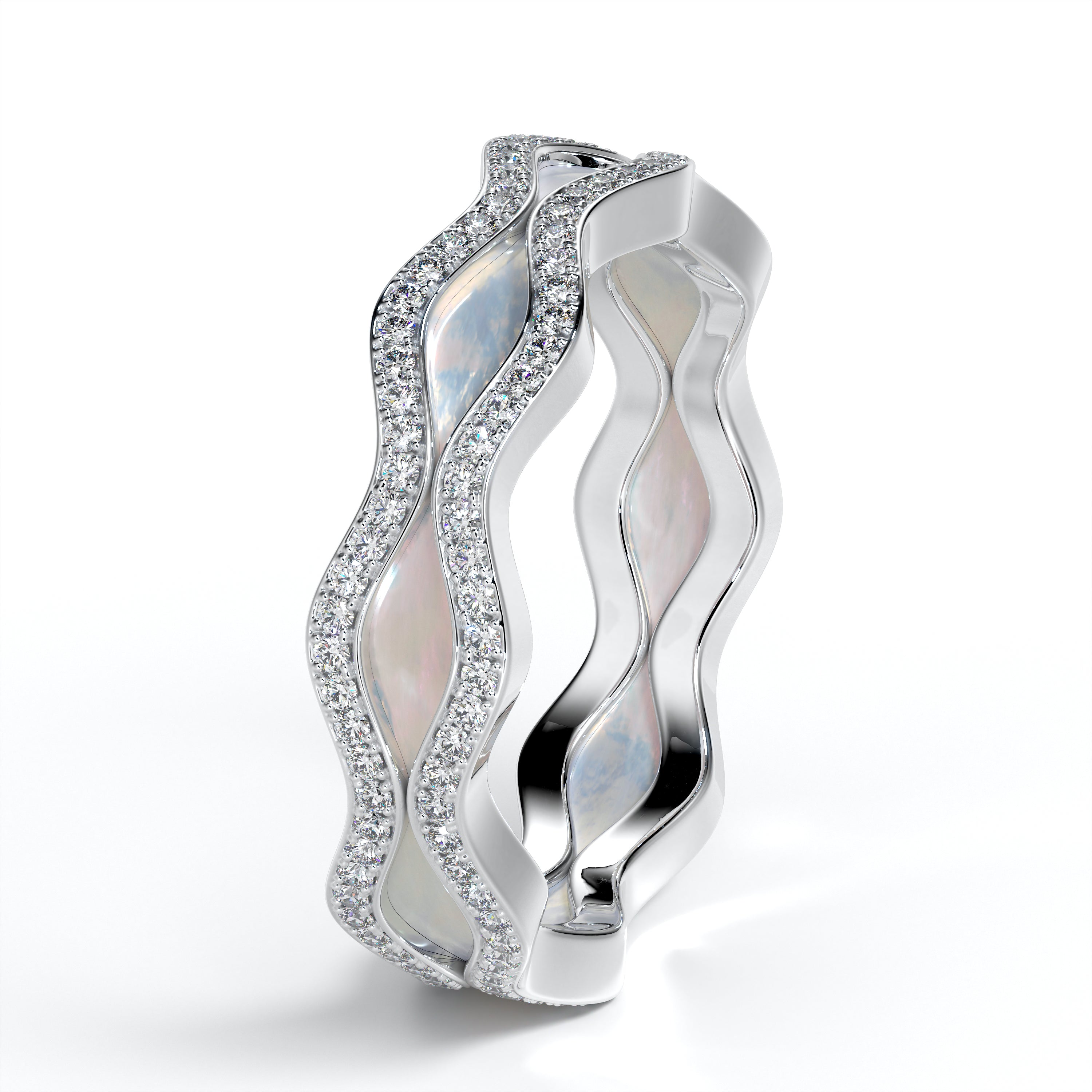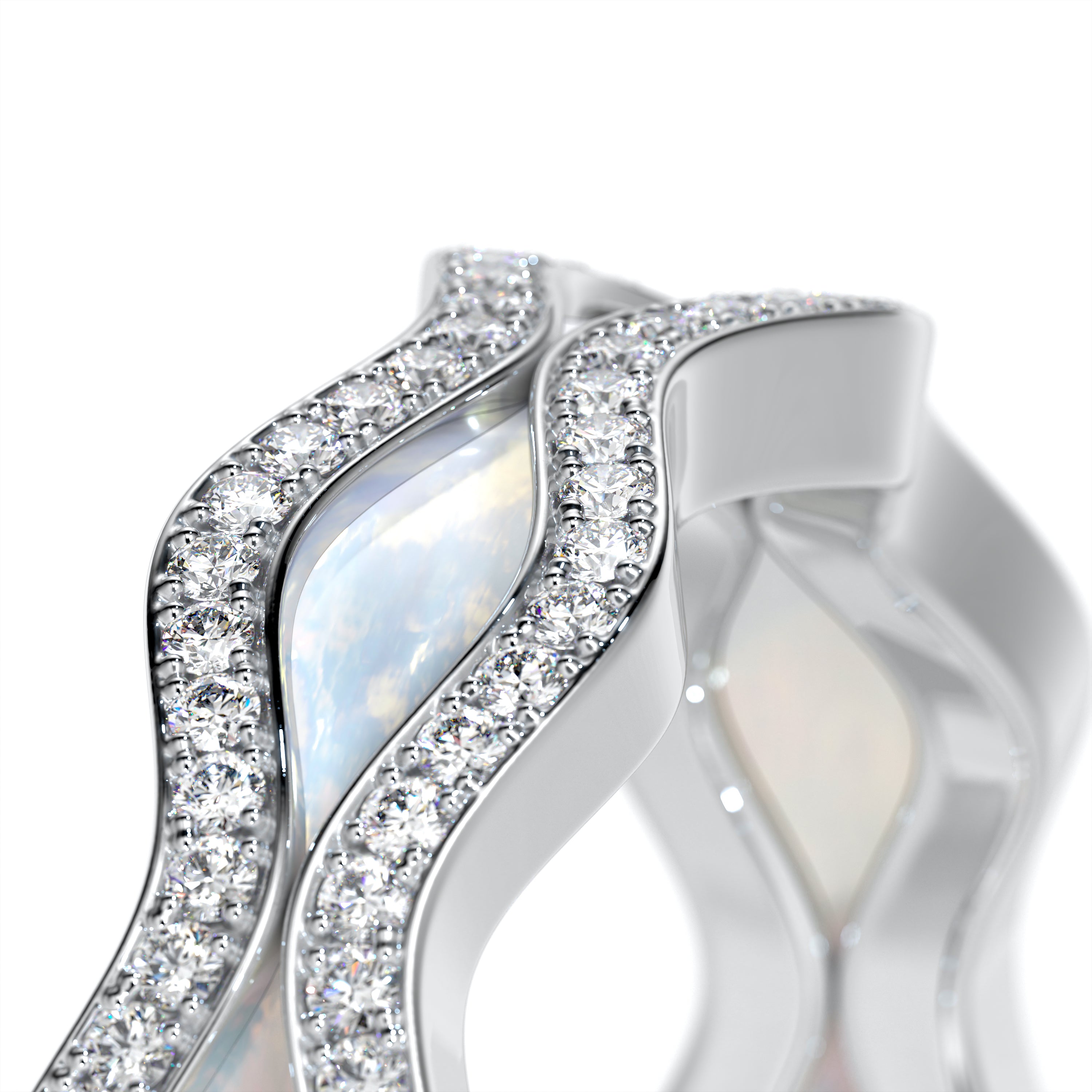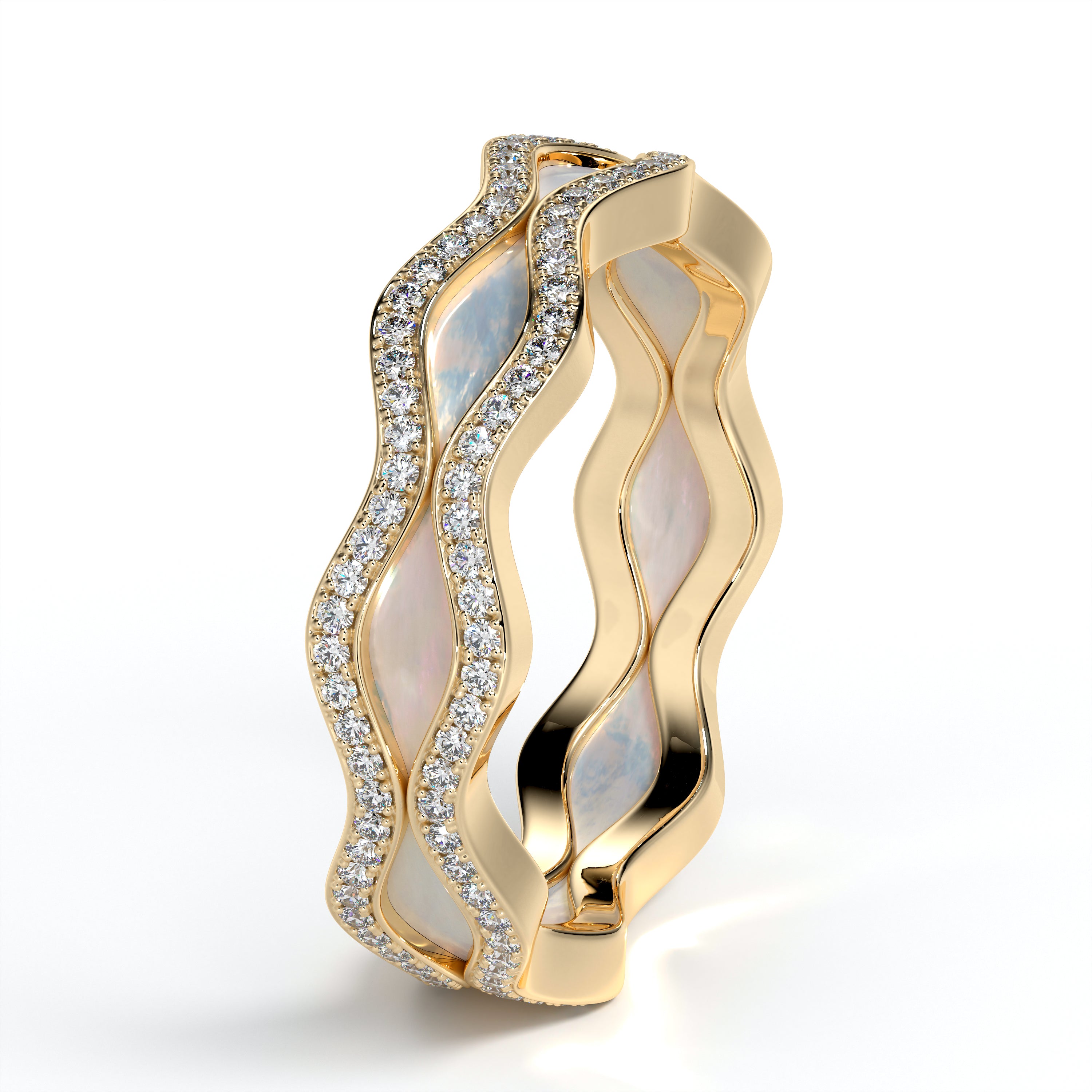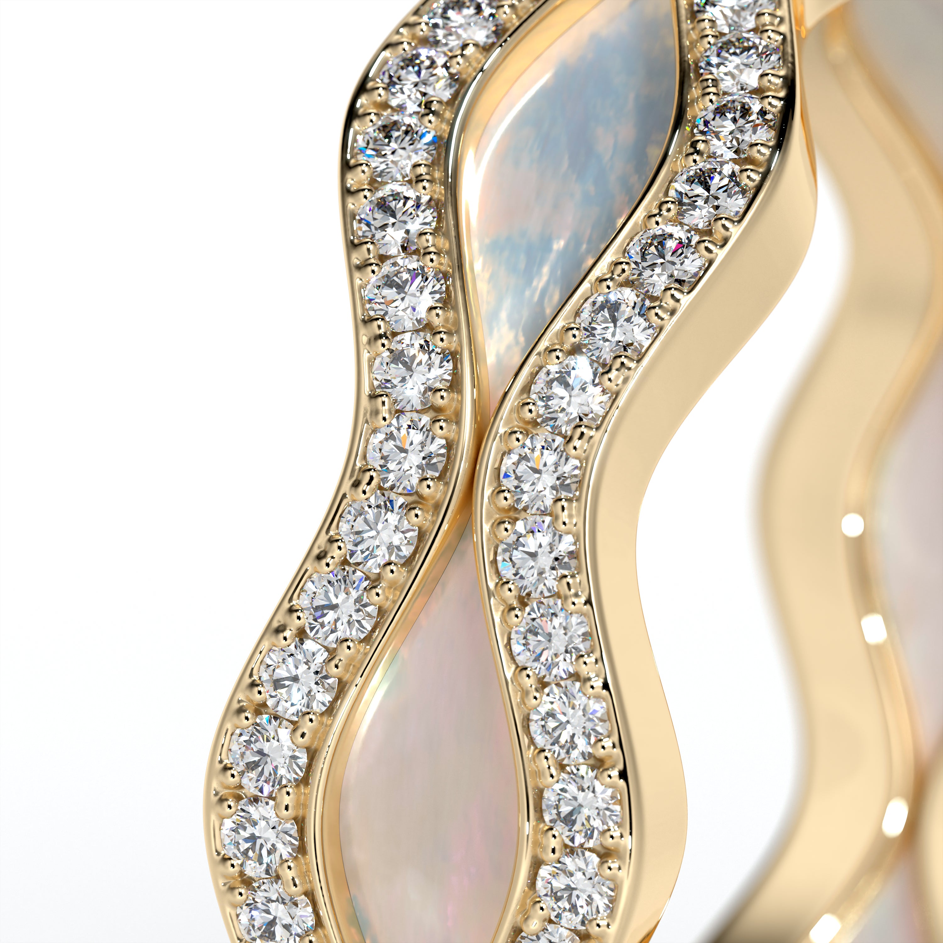 The Vivid collection is crafted with exceptional complexity, requiring the precise assembly of 10 to 18 individual parts, each demanding a perfect fit. The design celebrates the beauty of the Riviera through natural bends and flowing shapes, using mother of pearl to capture the hues of the ocean. The model itself is intricate, with a minimum of 10 parts required for the simple Vivid ring. The mother of pearl model consists of 18 parts, including 8 custom-shaped mother of pearl pieces for every ring, showcasing the detailed craftsmanship behind each design.